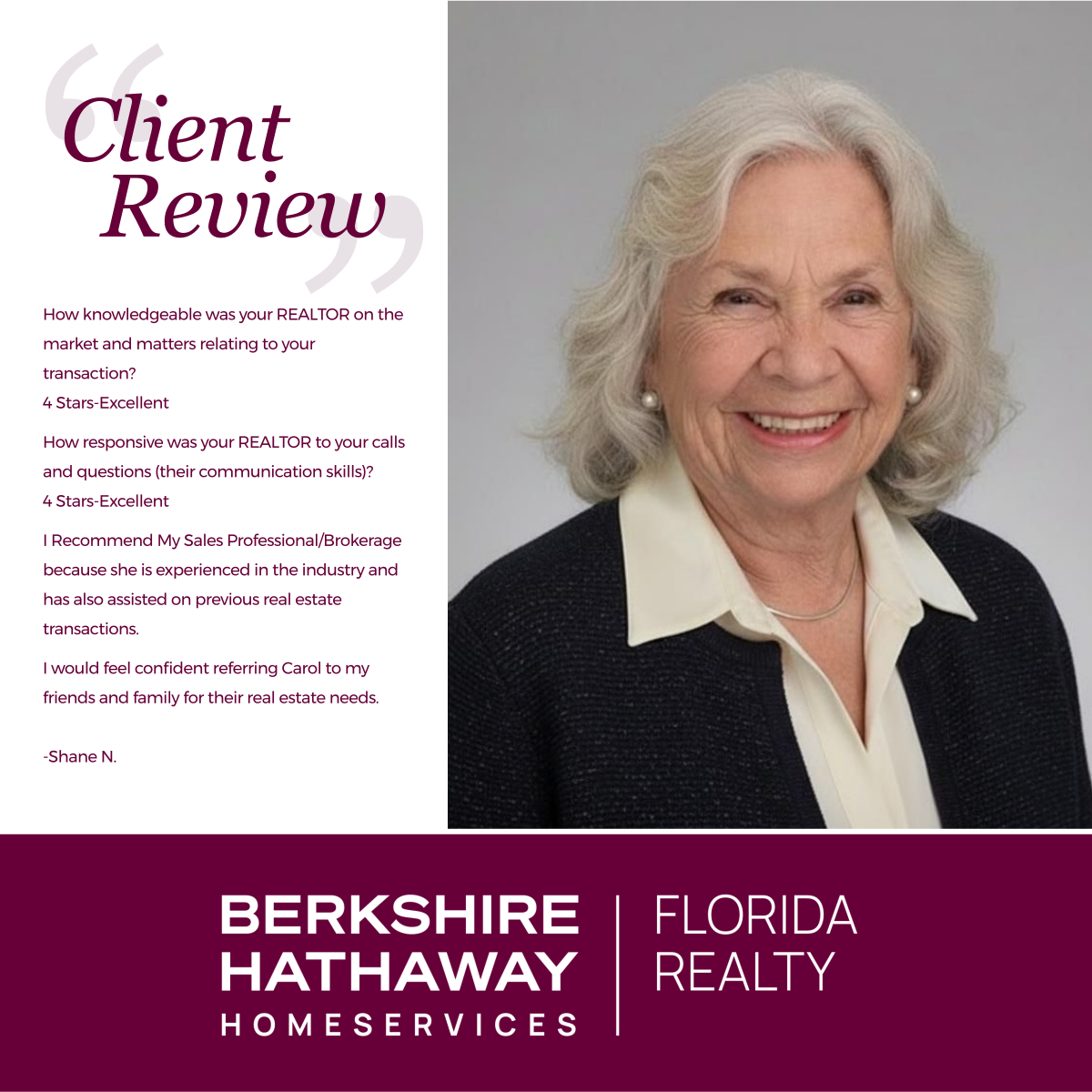 | Carol is a wonderful, warm, caring, knowledgeable professional agent. BHHS Florida Realty is a great agency and we are so glad that we found them!-John & Joan D. |